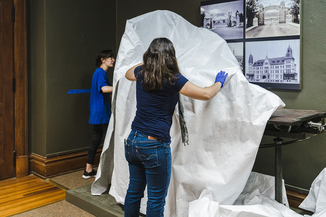 - Throughout construction, Museum staff dismantled exhibits and moved hundreds of artifacts from exhibit spaces and storage area. Nearly every space in the building was touched by construction, and the CSPM team focused on collection preservation and protection efforts throughout the main building. Museum staff was in the courthouse everyday managing supporting the construction project.