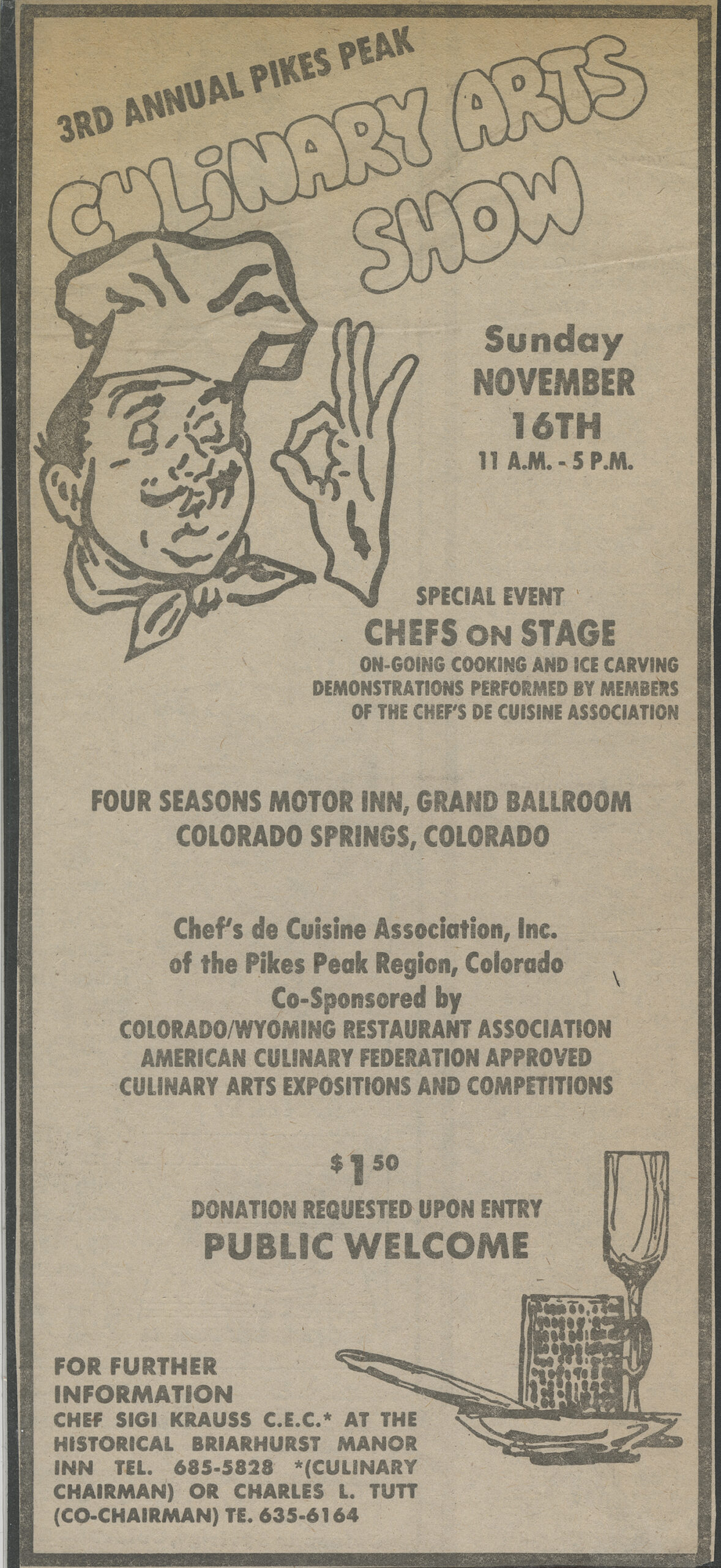 Many of you likely know of Chef Sigi for his world-class culinary creations, and the warm ambience of his Briarhurst Manor Inn—which he first opened in 1974 and sold in 2006. Some of you may have attended the culinary apprenticeship program at the Pikes Peak State College under the ACF.  Or, you may have attended their annual culinary shows in venues across the region.