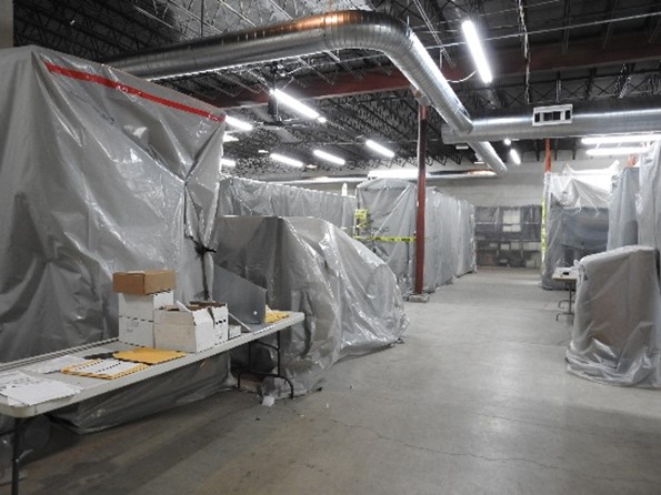 First, the CSPM collections team prepared for construction and assessed the potential impact on artifacts housed in the collection storage facility. Collection and preservation are a crucial part of the CSPM’s mission. It was important for the CSPM Registrar, Caitlin Sharpe, to determine these steps before moving forward with the construction process. Artifacts were relocated to other locations in the offsite storage facility that were not impacted by construction. Staff wrapped artifacts and shelves with protective sheets to keep them safe from dust and debris due to construction.
