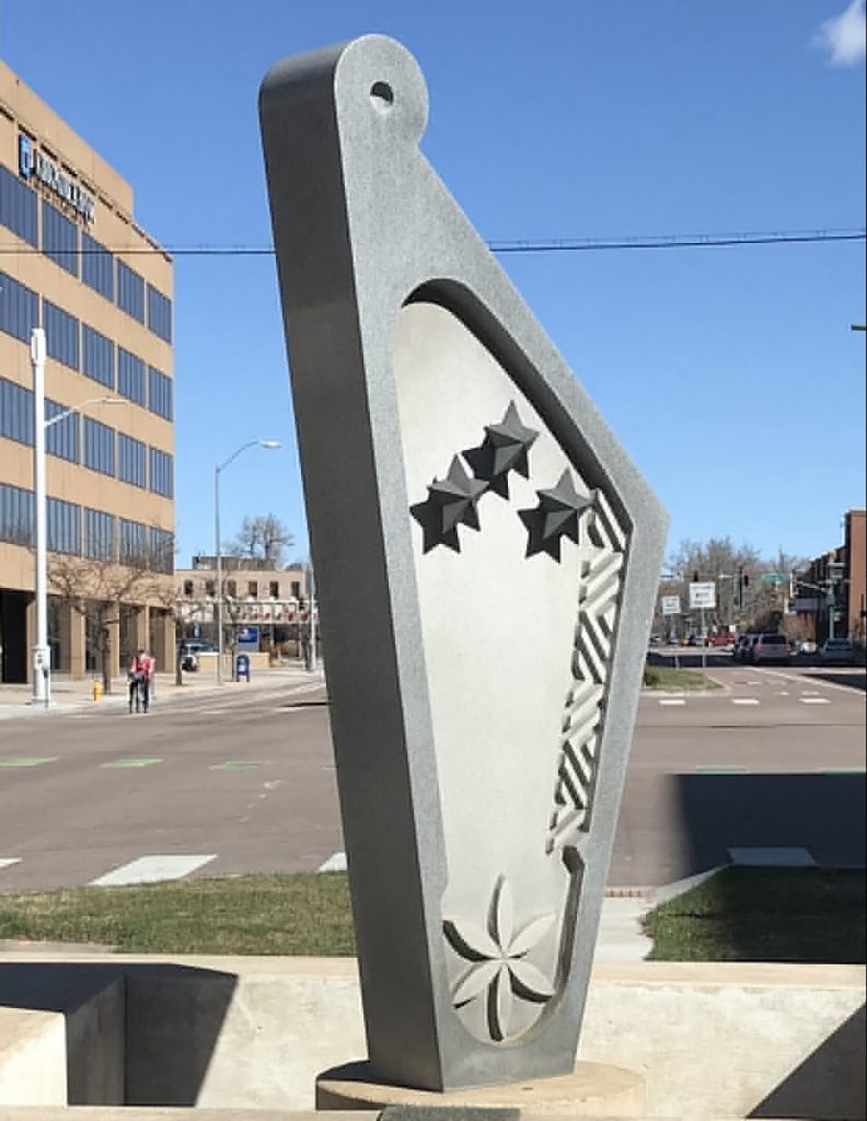 The Latvian Freedom Fountain, located in the median on Cascade Avenue in front of the Penrose Library, was erected in 1970 to celebrate the 50th Anniversary of Latvian independence. The abstract granite form represents a “kokle,” a traditional Latvian harp, and the three stars on either side of the granite reference the Latvian Coat of Arms. When it was erected, Latvia had lost their independence under Soviet rule. Many Latvians, such as the Fountain’s sculptor Ansis Berzins, were forced to flee their country and found refuge in the United States.