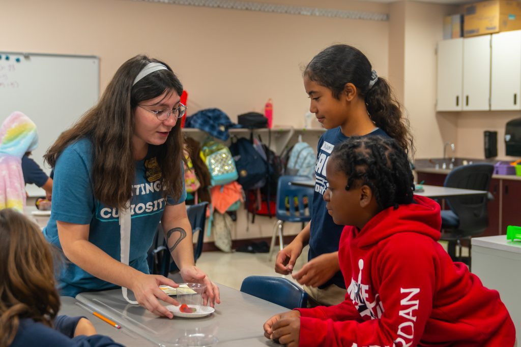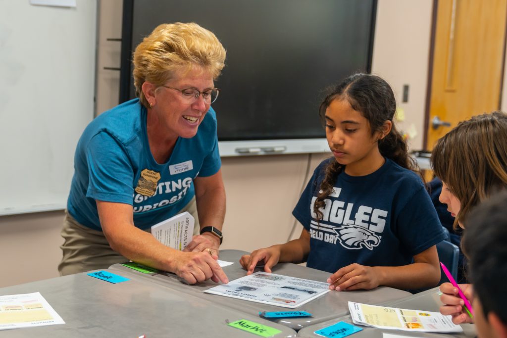 Kristen is new to the CSPM volunteer team this year and was invited by a friend from her hiking group, Karen Hardwick. She shared that “As a retired history teacher, I value CSPM’s programs that create hands on, high interest activities that fully engage students. The activities are well prepared and captivate students’ attention.” This semester she has enjoyed working with students in the classroom, “Engaging with students while circulating the groups is so gratifying and helps their focus. Their excitement is contagious. Students make so many connections and comments during the activity and get such a kick out of getting the stamp and badge sticker.”