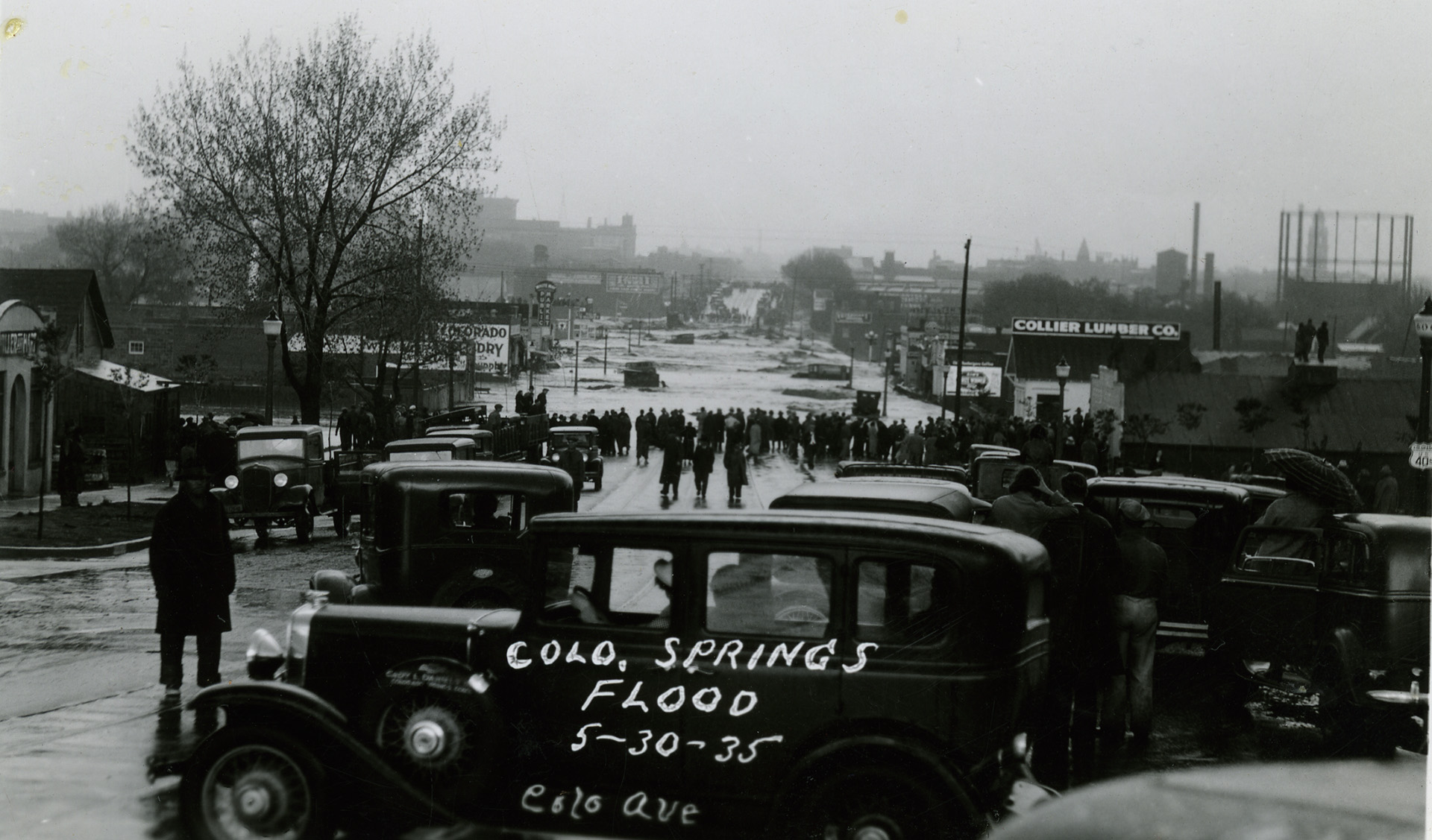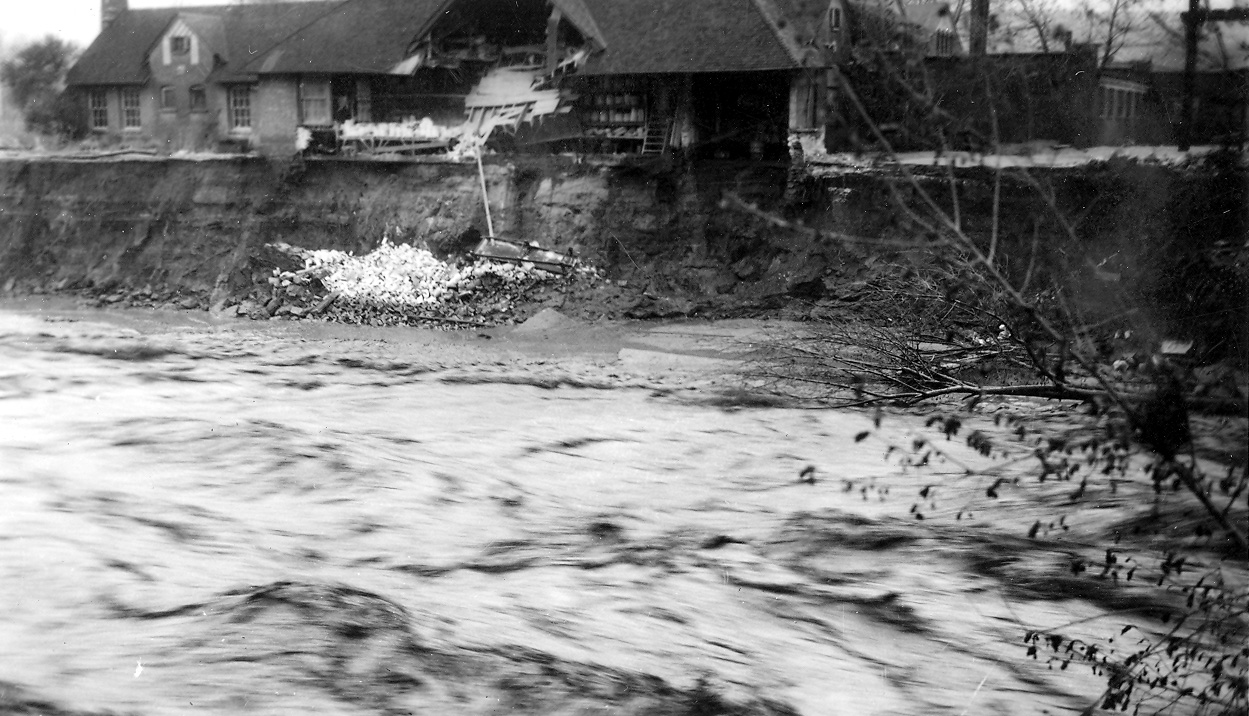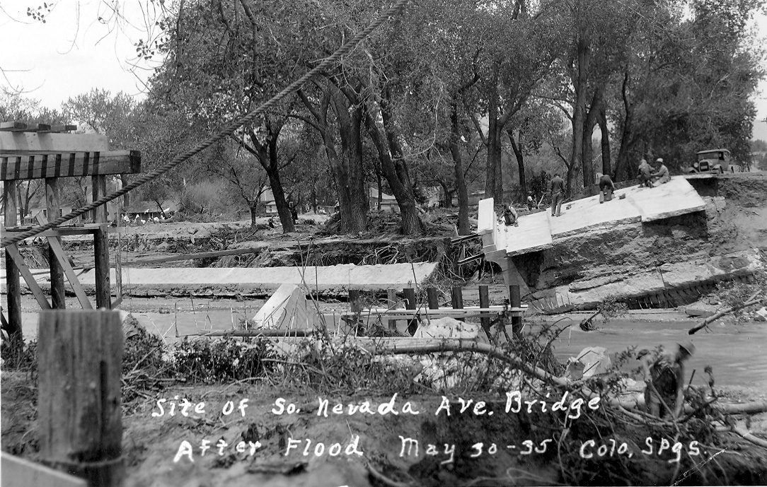 In the midst of a drought, during the devastation of the dustbowl in southeastern Colorado, a storm pushed from the northeast against the Rampart Range and dropped over 7” of rain on Memorial Day, 1935. A massively destructive flood hit Colorado Springs and El Paso County. Monument and Fountain Creeks overflowed their banks, destroying 70 houses and killing at least six people. In Monument Creek, that today averages around 20 cubic feet per second (cfs) flow (with peaks up to 1,500 cfs), water reached close to 50,000 cfs. Witnesses reported 10 to 15 foot waves. Every bridge over Monument Creek was washed out, with the exception of the viaduct at Bijou Street. The Eight Street bridge over Fountain Creek was damaged, but remained open to one car at a time and provided the only connection between the city and the Broadmoor and Ivywild neighborhoods. In addition to the loss of city bridges, 47 bridges in rural El Paso County were heavily damaged. Railroad and highway connections outside of the city were cut off. Sewer lines were busted, the electricity and power plants flooded, and three miles of the El Paso Canal washed out. Hard hit was Monument Valley Park, the jewel of the city park system since 1907. Where once were charming gardens, winding walks, and water features with picturesque bridges now lay uprooted trees, gravel, mud, and debris. Damage was estimated at over $1.7 million. Fortunately, depression-era Works Progress Administration programs were already established in the city building roads in Pike National Forest and erosion control projects in Palmer Park. These crews quickly went to work to rehabilitate and rebuild Monument Valley Park. The Monument Creek floodplain was widened and straightened, with riprap installed to slow down water and walls lining the creek. For the next six years, hundreds worked to rebuild the park and the city bridges. While flood control improvements were necessary, sixty-five acres of land previously used for park recreation was reallocated into the inaccessible floodplain, reducing the amount of usable park space.