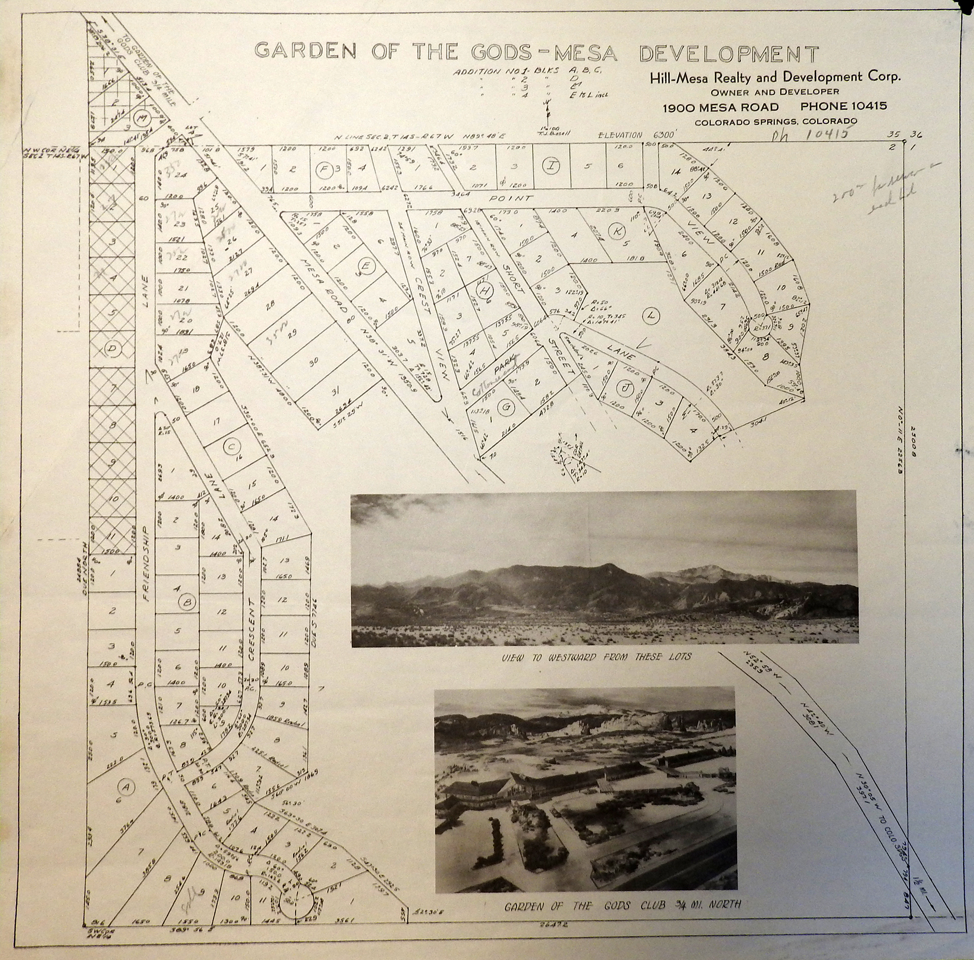 More important as the amenities, Hill wanted to build a permanent community on top of the Mesa. The club and resort were an exclusive and a temporary stay, drawing members from all over the country. However, Hill also wanted to build a more living community, with the club as its heart. 900 plots were set aside for houses to be built on the Mesa in what was described as a “dream city.” And certainly, with a view overlooking the Gateway to the Garden of the Gods, and the majesty of Pikes Peak towering beyond, it was.