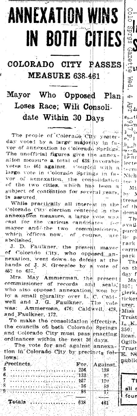 The annexation occurred on June 10, 1917. However, a small outlier remained outside of city limits. In response to the 1913 Colorado City vote to outlaw liquor, 37 west side residents voted to incorporate a new town of Ramona on August 22, 1913, located just north of today’s Thorndale Park on 24th Street. They immediately approved liquor sales and the small town prospered from its saloons. Ramona suffered the moral outrage of regional leaders, who refused water services and led gambling and prostitution raids in 1914. Statewide prohibition took effect in 1916, forcing Ramona to shut its saloons. It dis-incorporated in 1947 and was annexed in 1955.