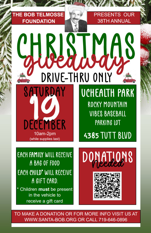 The Christmas Giveaway has become an essential holiday fixture in Colorado Springs. Since Bob’s death in 2006 the people of Colorado Springs and the organizers of the event have continued the Giveaway every year, even during uncertain times. In 2007 the event was cancelled because a venue could not be secured. A local business owner stepped in to host the event. Although there was less than a month to prepare and secure donations the Giveaway went off without a hitch. In 2020 the COVID-19 pandemic prevented the event from being held in its’ traditional format. The organizers adapted to a drive-through format and requested gift card donations in lieu of toys.