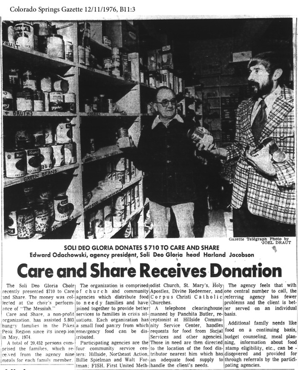 Sister Dominique Pisciotta saw the consequences of hunger in the Colorado Springs community. In 1972 she started the food bank that became Care and Share. Partnered with the Pikes Peak Food Bank and several local churches, she organized food acquisition and distribution with volunteers to the needy. At first, the food bank operated in the basements and garages of volunteers and churches before it grew into its first warehouse. Between May 1974 and November 1975, 6500 individuals in crisis received enough supplies for three days. This model of a three-day supply is still in use by Care and Share today.