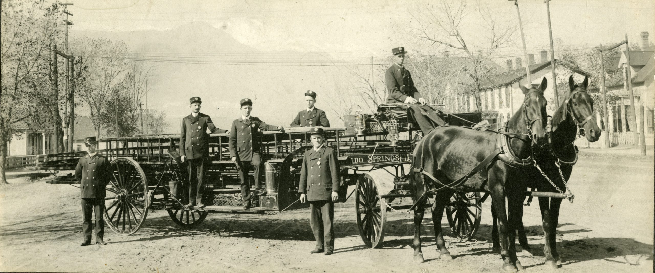 From our very beginning in 1871, the early settlers of Colorado Springs saw the need for organized fire protection. They soon progressed from volunteer bucket brigades with water from hand-dug wells to the development of the El Paso Canal, bringing water from Fountain Creek in 1872. In May of 1873, the first “fire extinguisher on wheels” was purchased. The next big step was made in 1878 with water “piped” from higher reservoirs, making water available throughout the “city” as it grew, starting with 20 fire hydrants. Early Hook and Ladder companies, formed initially as competitors, soon grew into a coordinated “protection team”.