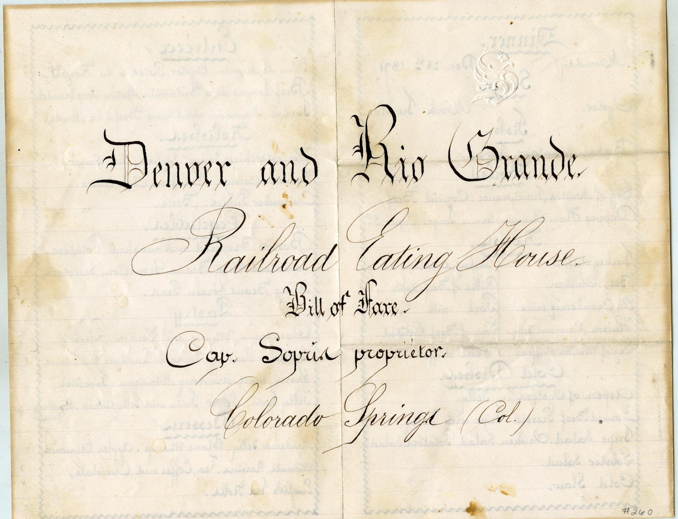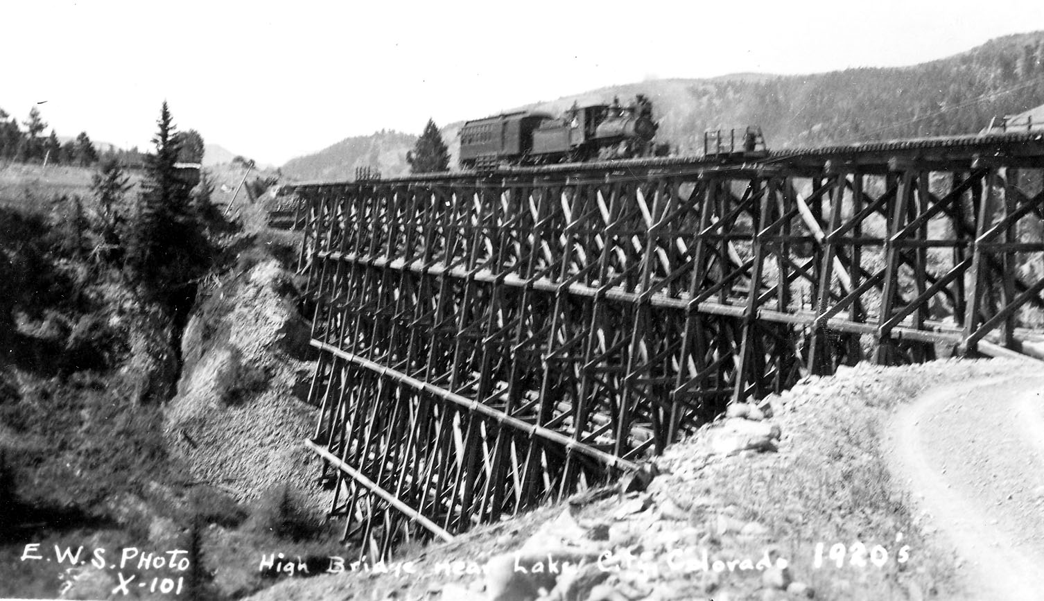 Begun January 1, 1871, the first line from Denver followed the Plum Creek wagon road over Palmer Divide through what is now the town of Palmer Lake, then down Monument Creek to its junction with Fountain Creek. The first passenger train arrived in Colorado Springs on October 27, 1871, beginning service on the 65-mile route that took 5 hours at a pace of 15 miles per hour.