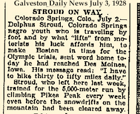 Stroud was also a phenomenal athlete. On March 5, 1928 he broke a twenty-five year old record for the fastest round trip climb of Pikes Peak, accomplishing the feat in three hours and ten minutes. In June of that year he won the 5,000 meter run in the regional track and field trials in Denver. Participants in the race were informed that the winner would be awarded paid transportation and expenses to the national Olympic Trials in Boston.