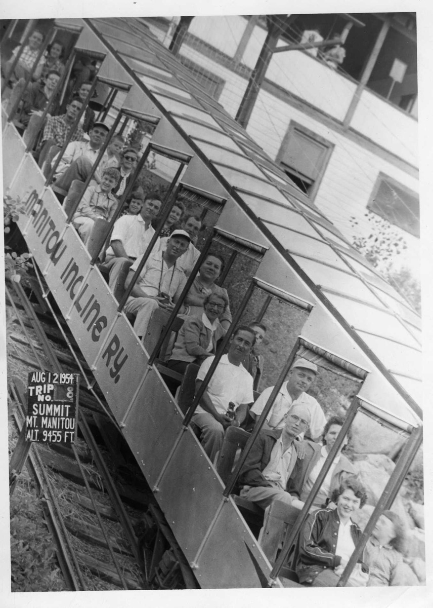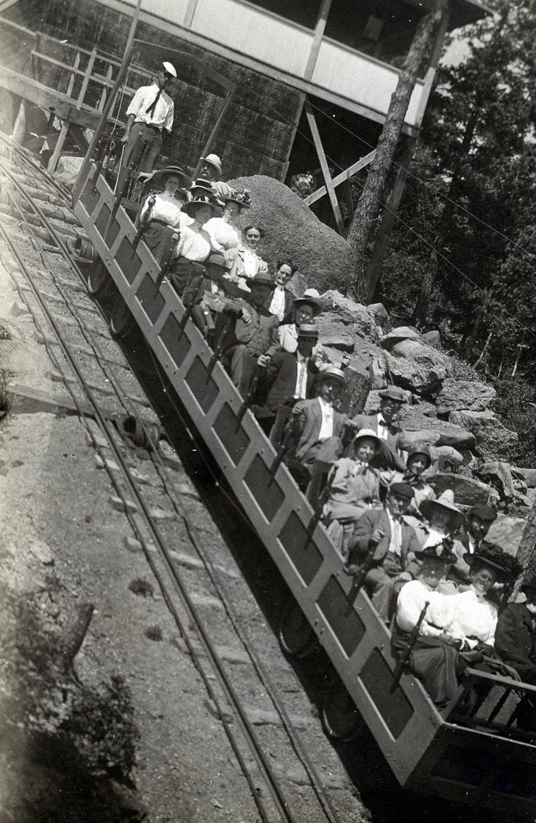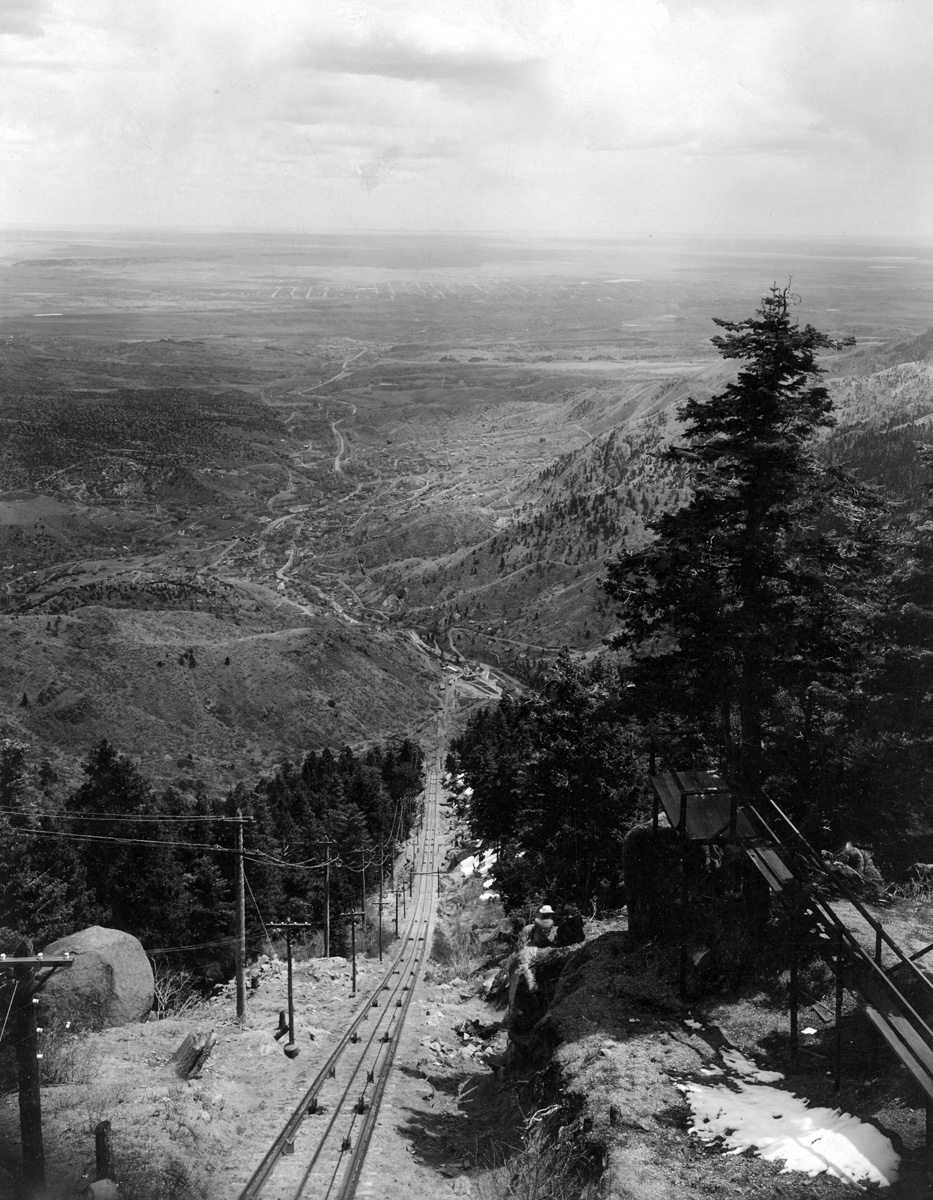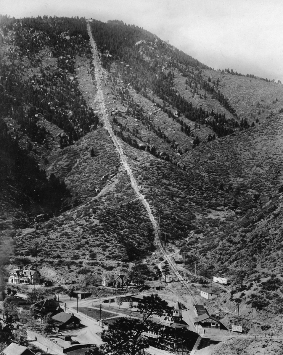 Before the Incline became a popular hiking trail it first functioned as a 3-foot narrow gauge funicular railway built in 1907. The railway serviced a hydroelectric plant and gravity-fed waterline that provided water to both Manitou and Colorado Springs. After several years, the track was sold to Dr. Newton Brumbach who turned the Manitou and Pikes Peak Railway into a tourist attraction. Advertisements for the Incline boasted a 16-minute ride to the top that promised the visitor the opportunity to behold “scenic splendors” and claimed to be the “longest and highest incline on the globe.”