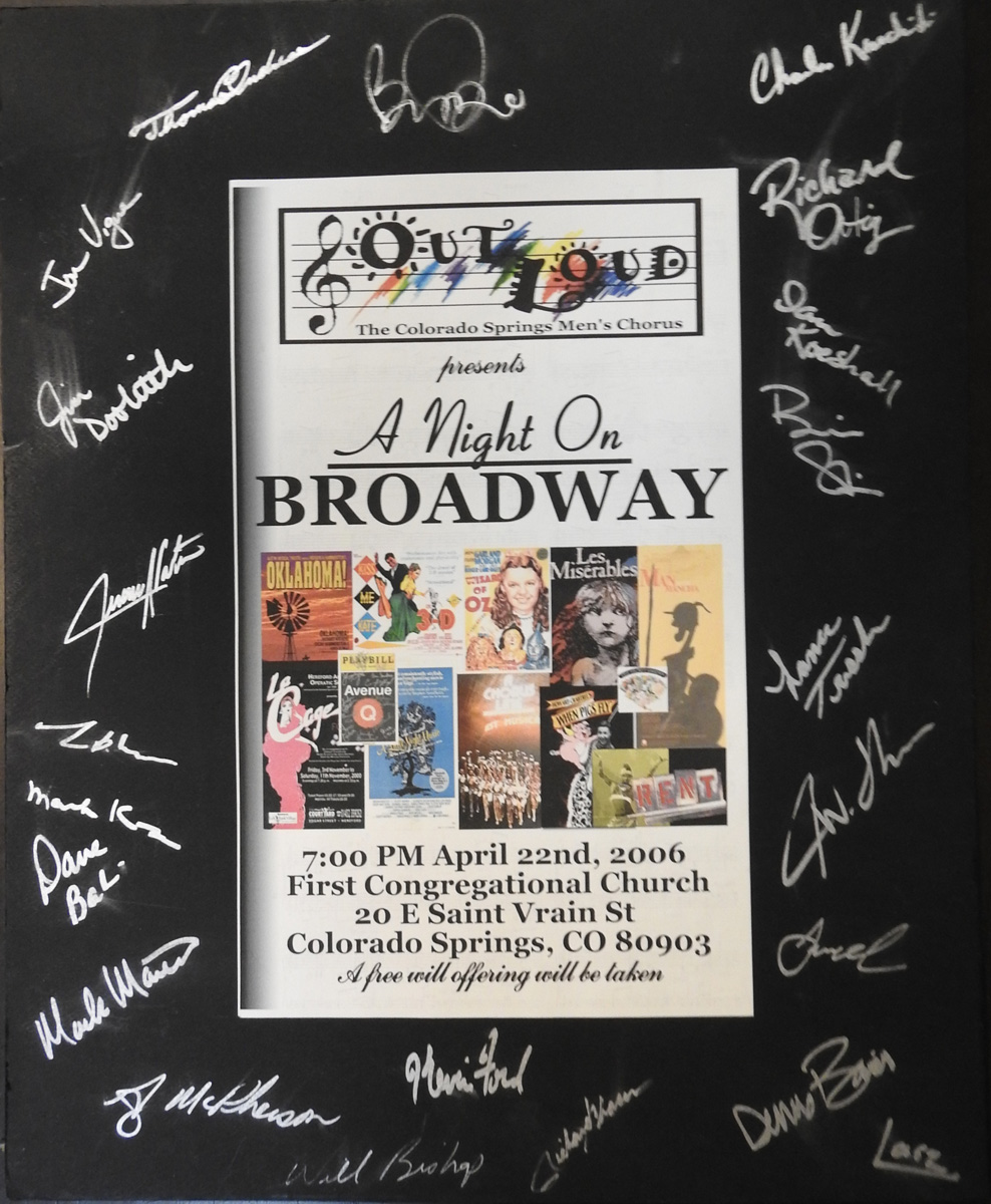 Out Loud originated in October of 2005. Guy McPherson organized a group of nine gay, male parishioners from the First Congregational Church to put on a choral performance. The congregation was so supportive of the performance that McPherson decided to organize Out Loud Colorado Springs Men’s Chorus. They began rehearsing in January of 2006 and quickly grew from nine members to 21. In April of that year, they put on their first performance “A Night on Broadway” under the artistic direction of Charles Kurchinkski. The choir expected a few hundred people to show up on April 22, the night of the performance. However, an estimated 900 people showed up to hear, and support, the first gay men’s choir in the city.
