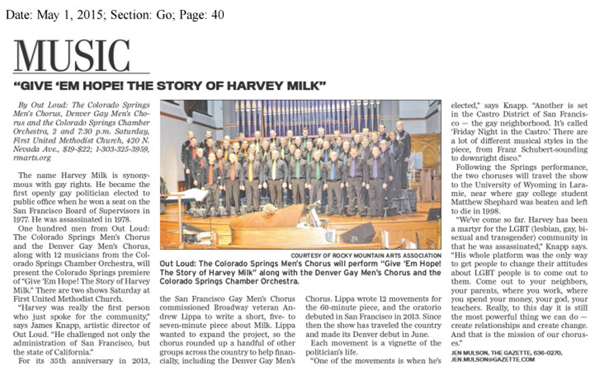 Out Loud Colorado Springs Men’s Chorus has played an integral role in making Colorado Springs’ gay community more visible and accepted. They have also made it an active mission to inform the community about gay history and culture. In 2015, donning rainbow-colored ties and joined by the Denver Gay Men’s Chorus and the Colorado Springs Chamber Orchestra, Out Loud performed “Give ‘Em Hope! The Story of Harvey Milk” which told the story of America’s first openly gay elected politician. Then in 2019 Out Loud performed “50 Shades of Gay: A Commemoration of the 50th Anniversary of Stonewall” which discussed the events of the Stonewall raid in New York City. Out Loud has become a cultural fixture of Colorado Springs, showing just how far the city’s notion of acceptance has come.