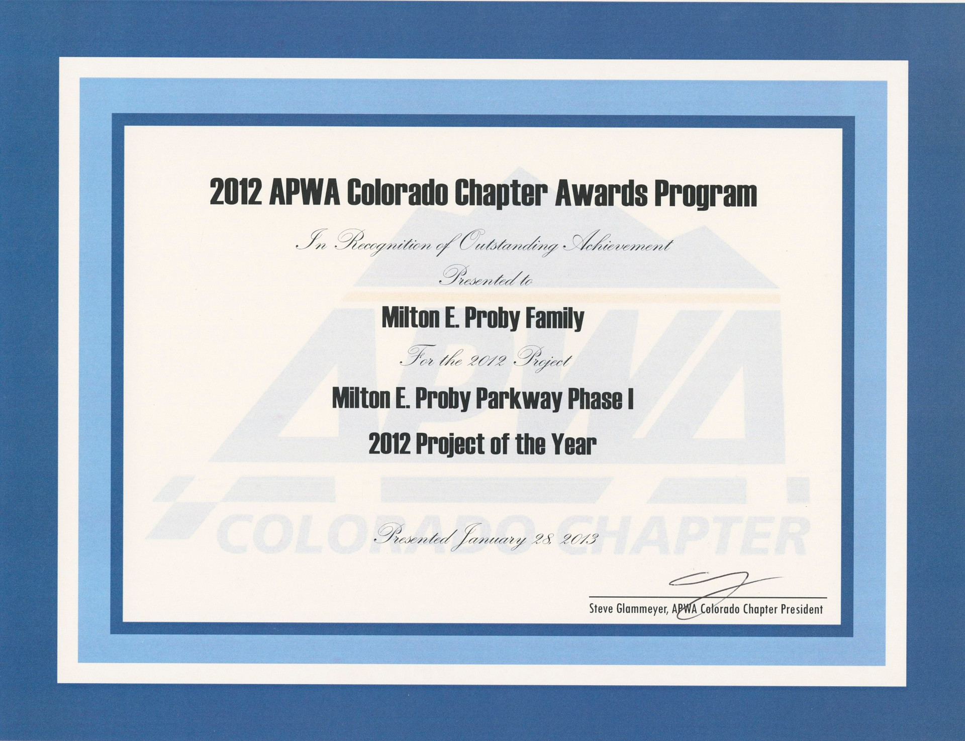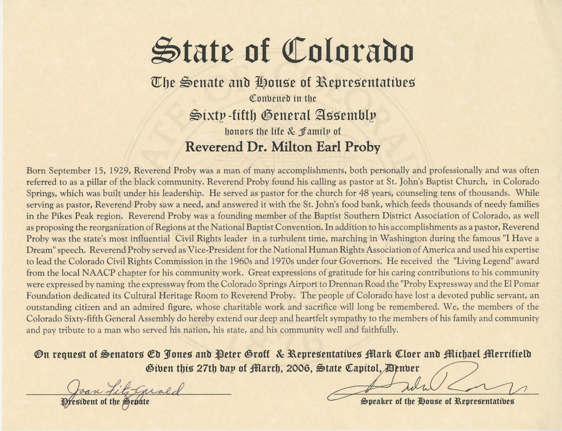 Reverend Milton E. Proby died on May 21, 2005 at 75. Nearly one year later, friends, relatives, supporters and City of Colorado Springs officials gathered to dedicate Milton E. Proby Parkway. His name, his legacy, and the results of his dedication to civil rights live on.