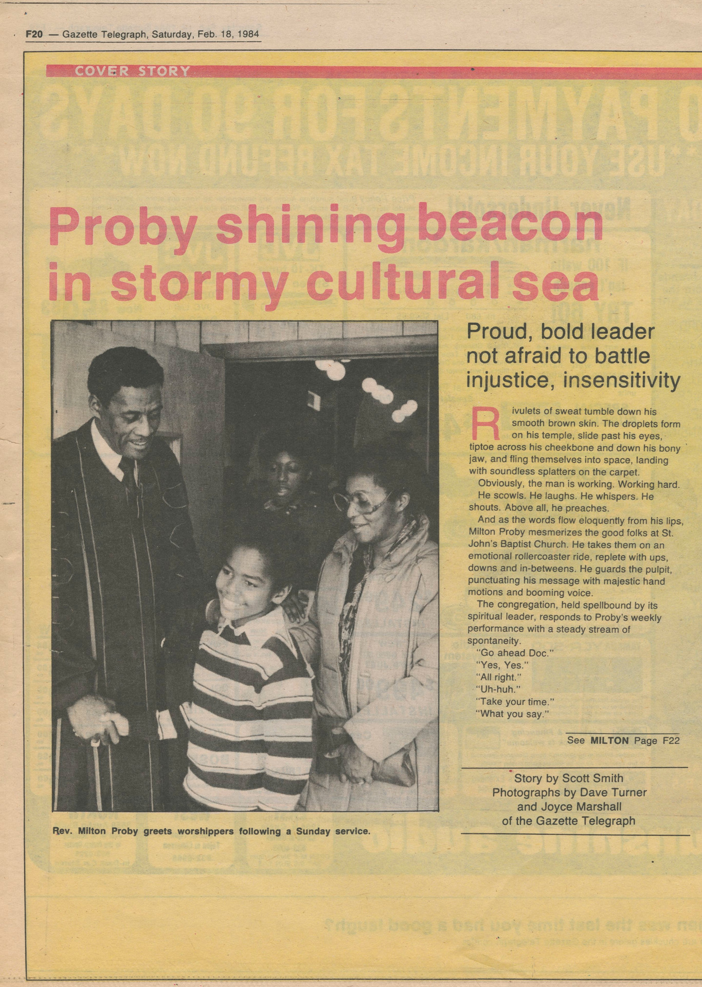 Born in DeKalb, Texas in 1929, Milton E. Proby grew up in the segregated Jim Crow South. After graduating High School, Proby joined the U.S. Army and served in the Korean War. These experiences led to a lifelong commitment to civil rights and humanitarian work.